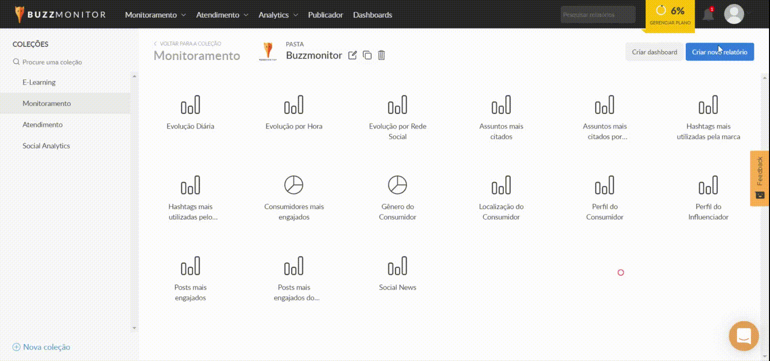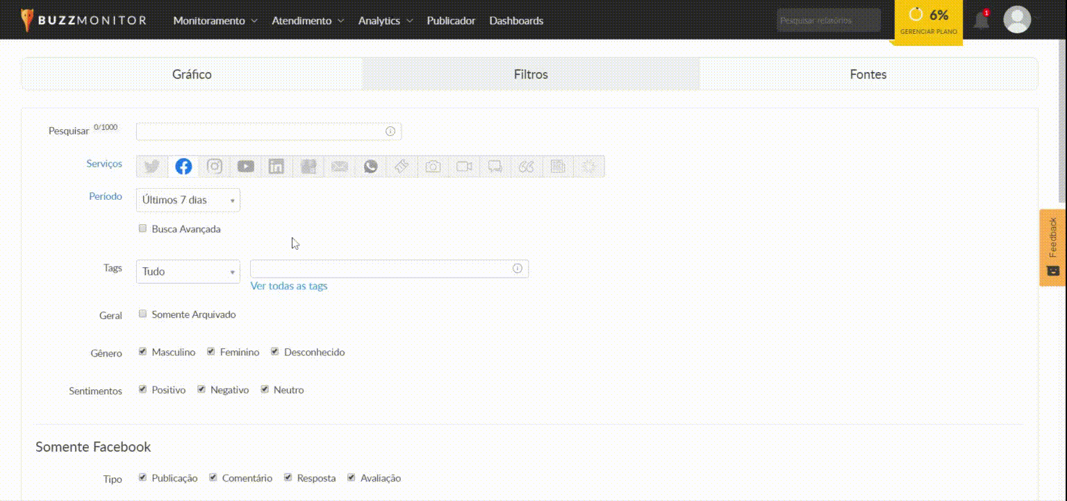 - Adicione o mesmo filtro explicado acima nos relatórios que você quer adicionar no seu Dashboard. Lembrando que o Buzzmonitor já oferece 14 relatórios automáticos caso queira utilizar esses mesmo gráficos, basta adicionar a URL como falamos acima.