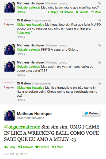 Caso Miley Cyrus: Talvez seja um dos cases mais emblemáticos. O Matheus fez uma pergunta simples para o Oi Galera, que poderia ter sido respondida de forma tradicional. Mas, ao invés disso, a equipe de analistas preferiu antes olhar o histórico do cliente através do Deep Profiling do Buzzmonitor, o que resultou em uma ação muito mais divertida e eficaz.