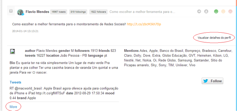Deep Profiling: é uma das nossas funções exclusivas, graças aos longos anos de armazenamento de dados. Com ela você terá acesso ao histórico do usuário na rede social e, no campo Mentions, estará visível todos os nomes de marcas, artistas, times, programas etc que o consumidor já citou no Twitter.