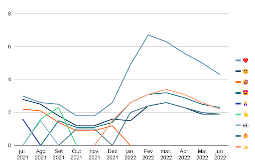 É interessante a queda no uso do Emoji de olhinhos (👀) de de rolando de rir (🤣) e a ascensão do brilho (✨).