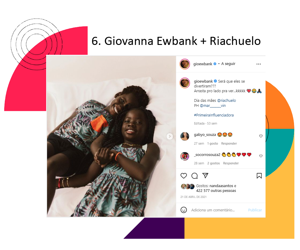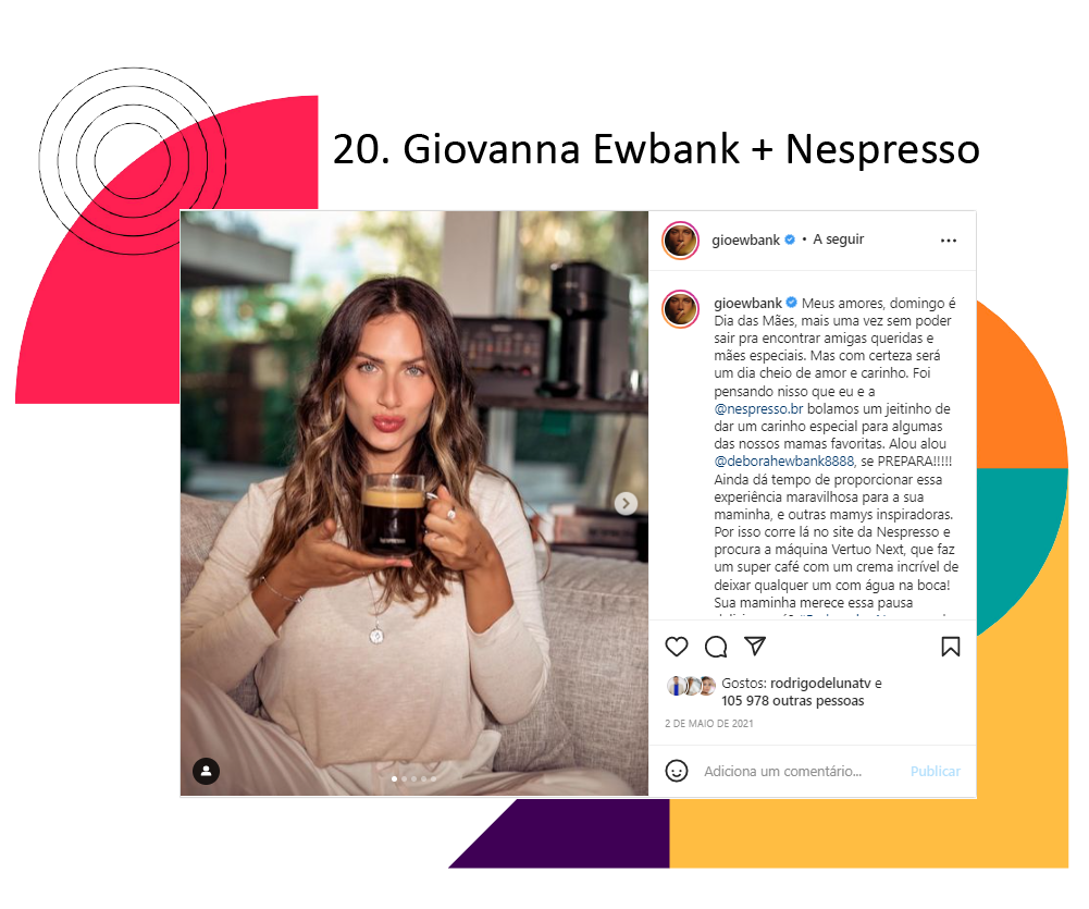 Um destaque interessante desse Top 20 Dia das Mães 2021 foi a atriz e apresentadora Giovanna Ewbank. Ela foi a influencer mais recorrente nas ações e fez parte de 5 posts, com campanhas para diferentes marcas, que foram publicadas em seu perfil e no perfil da marca. Em duas fotos ela aparece com os filhos, uma sozinha e outras duas são fotos só dos seus filhos.