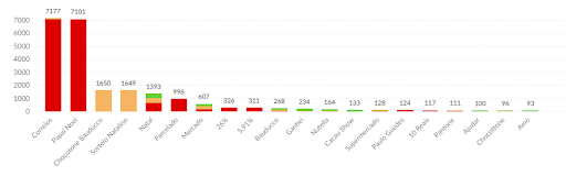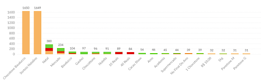 Ao analisarmos os assuntos mais citados relacionado a chocotone e panetone, eles aparecem associado a tradições de Natal como o “Papai Noel” (10.15% dos posts) e doações para as cartinhas de Natal dos Correios (10.26% dos posts). E no ranking vemos a preferência pelas marcas Bauducco, Cacau Show e pelo sabor Nutella. O produto “Chocotone Bauducco” é o terceiro assuntos mais citado.