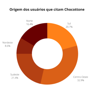 Em relação ao chocotone é do Centro-Oeste de onde vem a maior quantidade de tweets (32.9%) e do Nordeste (8.6%) o menor volume.