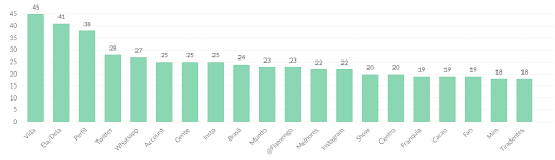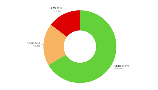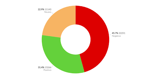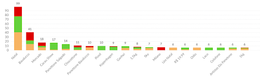 Enquanto as menções a chocotone são 66,5% positivas, nas menções à panetone elas são apenas 31,4%. Nos posts do panetone o sentimento negativo é o que predomina em 45,7% dos posts. Já o chocotone é criticado em apenas 14,7% dos posts.