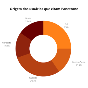 No agrupamento por região do Brasil, a que mais cita panetone no twitter é a região Sudeste. De lá foram publicados 29.3% dos tweets. E a que menos mencionou foi a região Nordeste, com 14.9% dos posts.