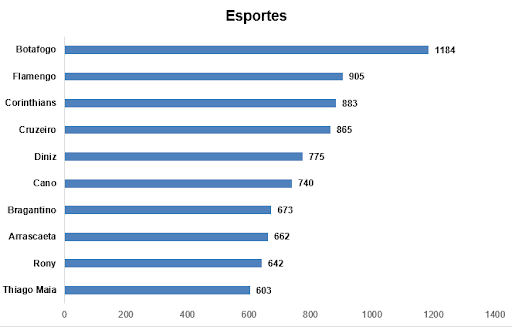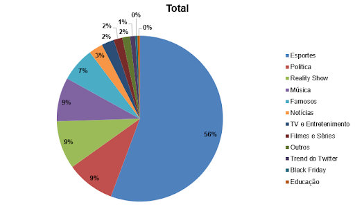 Embora a política tenha sido um tema de destaque, a categoria mais notável foi Esportes, representando 56% das discussões totais do público. Em seguida, destacam-se Política (9%), Reality Show (9%), Música (9%) e Famosos (7%).