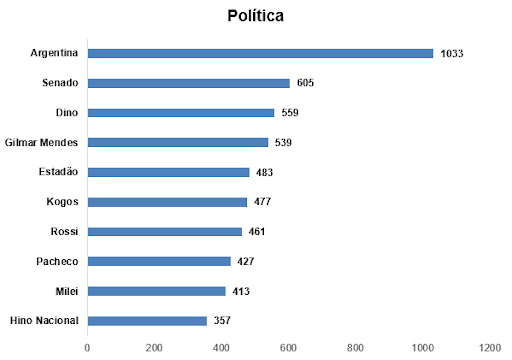 O confronto entre os candidatos Javier Milei e Sérgio Massa no segundo turno aconteceu em 19 de novembro e terminou na vitória de Milei, que conquistou 55,75% dos votos, levando o nome de ambos para o top 10 de temas mais recorrentes nos trending topics na categoria política. O chefe de gabinete Agustín Oscar Rossi também figurou entre os assuntos mais discutidos.
