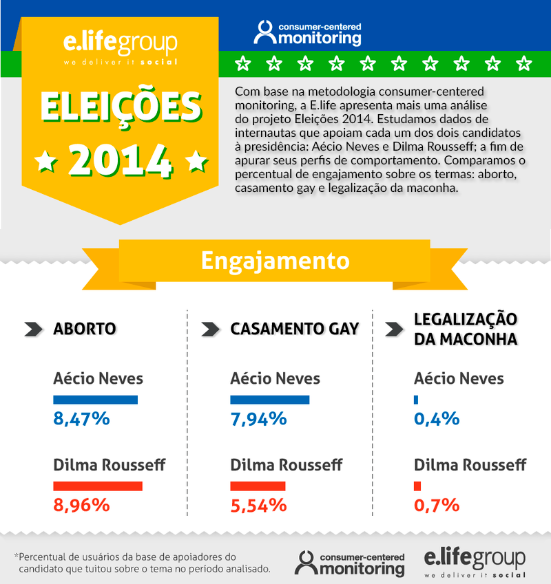 Como parte do projeto Eleições 2014, a E.life, através do Buzzmonitor Panel, realizou um levantamento da repercussão no Twitter sobre os temas: aborto, casamento gay e legalização da maconha no mês de setembro para uma base de apoiadores de cada um dos dois candidatos à presidência. A intenção do estudo é verificar o nível de engajamento dos apoiadores de Aécio e Dilma com os temas e as principais menções relacionadas à eles em cada base.