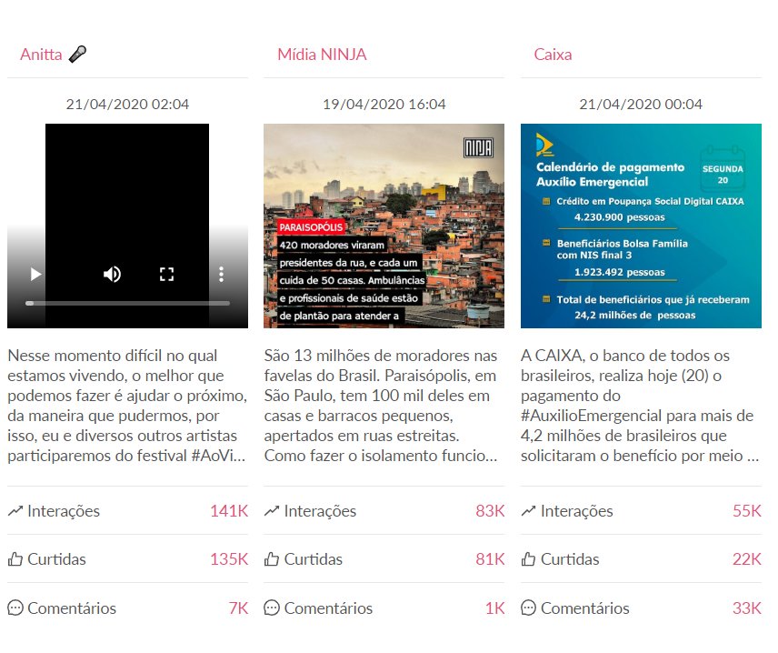 As outras duas publicações que aparecem no nosso top 3 apresentam os efeitos da pandemia nos brasileiros. O bairro do Paraisópolis em São Paulo é o destaque da publicação do site Mídia Ninja, atingindo 83 mil interações. O post fala sobre como os moradores do bairro paulistano se comportam durante a pandemia e a falta de recursos