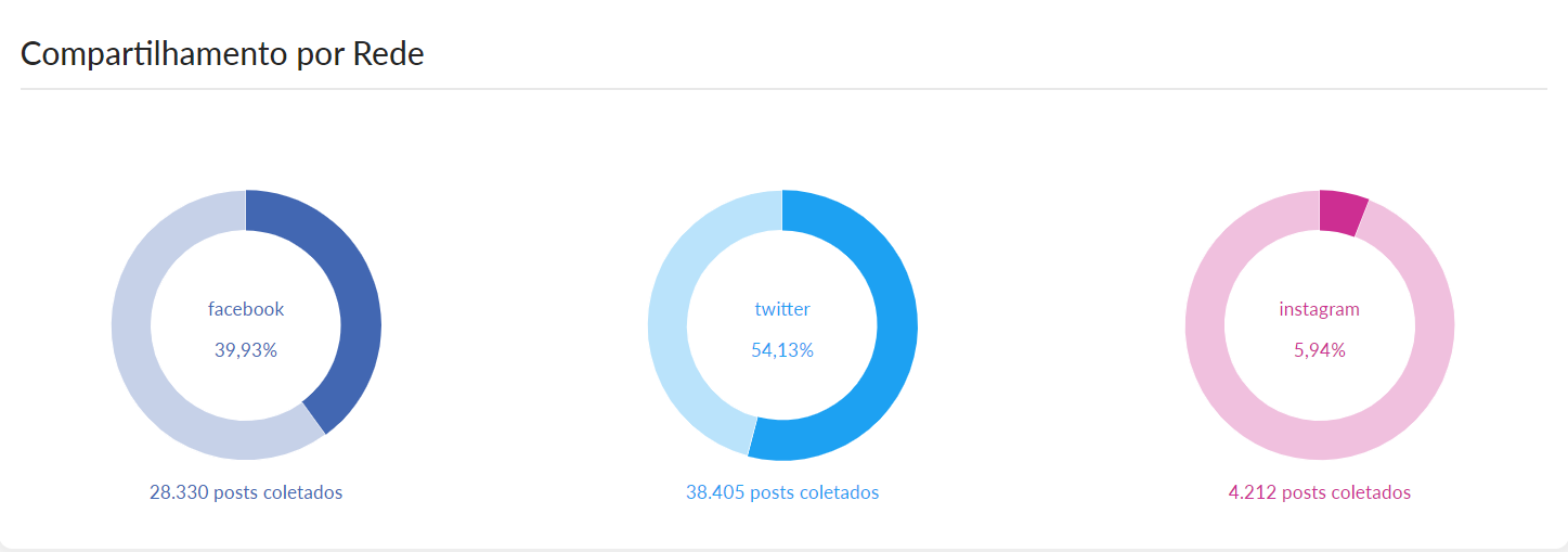 O Twitter é a rede social com maior número de menções no período analisado, com 54,13% dos posts, logo atrás aparece o Facebook com 39,93% e o Instagram com apenas 5,94%.