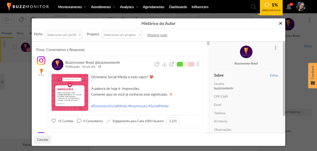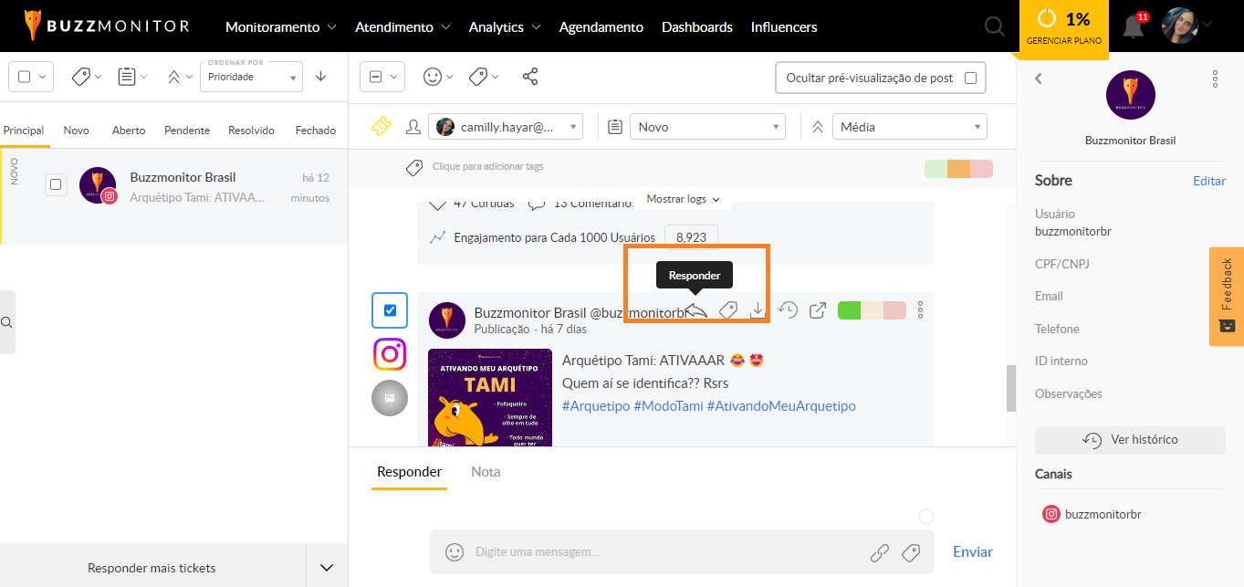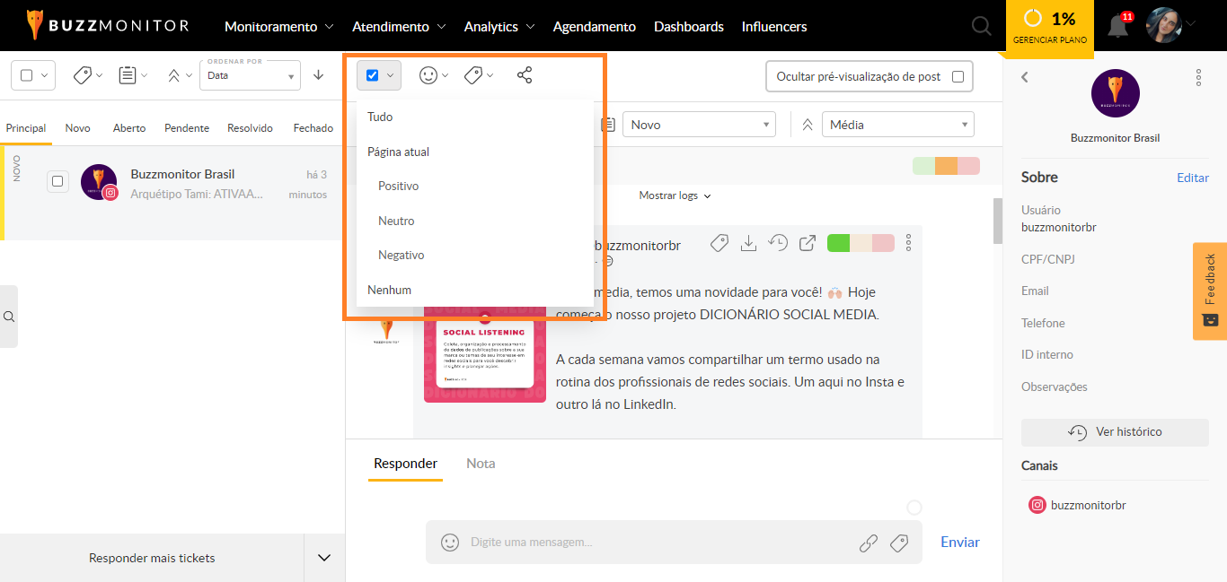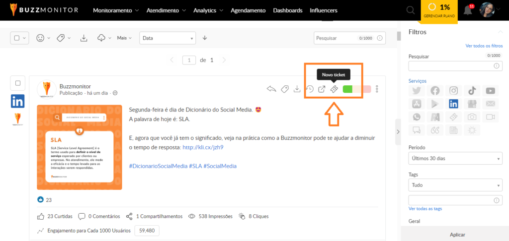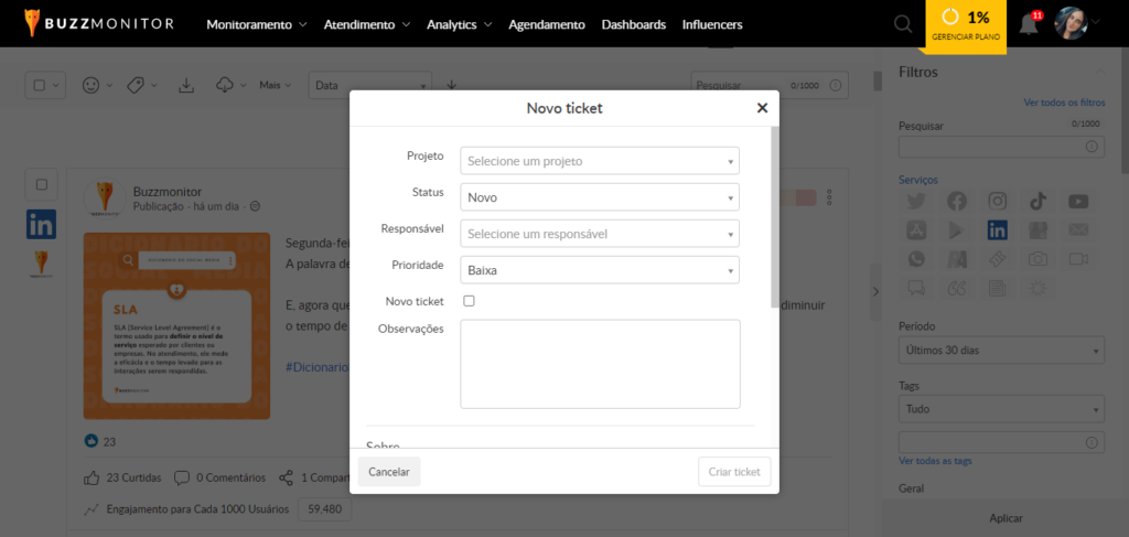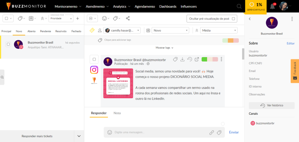 Ao receber as postagens nas redes sociais, além de armazenar a publicação e suas informações, a Buzzmonitor permite que seja configurada a abertura automática ou manual de um ticket.