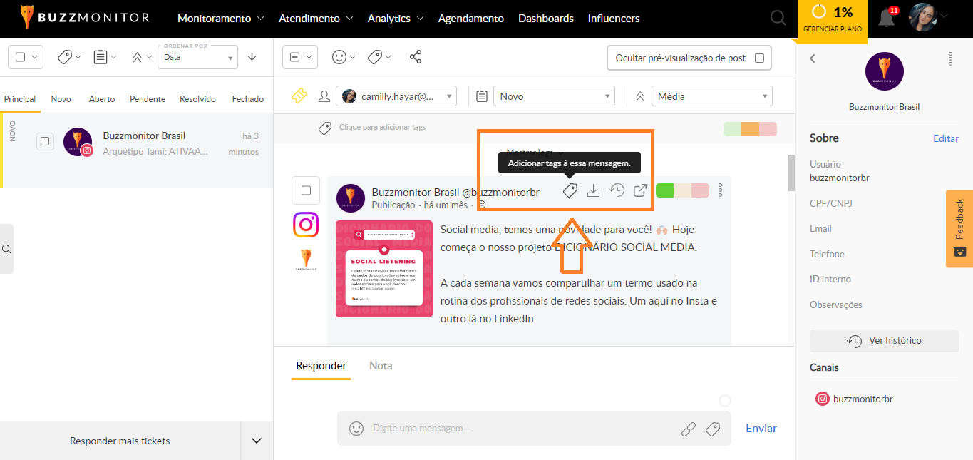 Os tickets permitem registrar informações adicionais aos posts que não são encontradas nas redes sociais, como: CPF, e-mail, número interno do cliente na empresa, número de uma compra, conta corrente, etc.