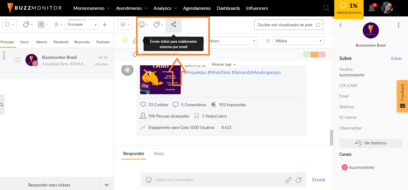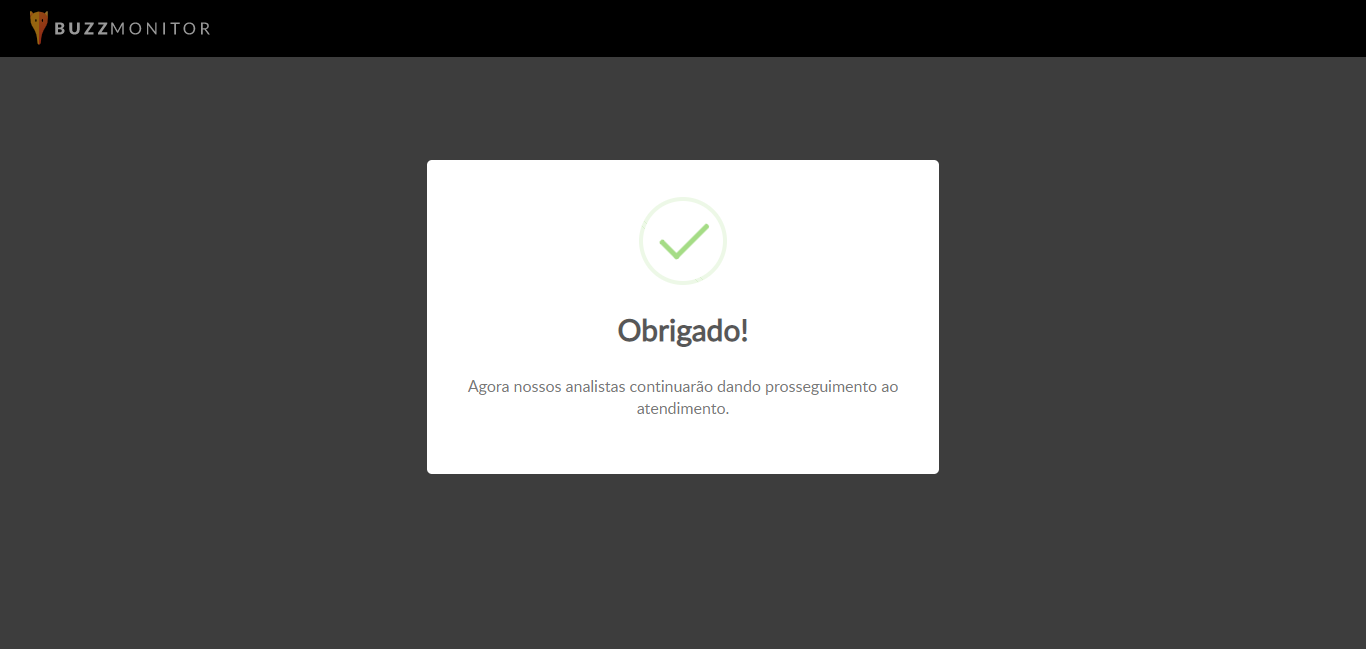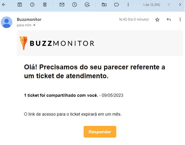Importante! Ao enviar um parecer no ticket, a pessoa que recebeu ele por e-mail vai ver uma mensagem da Buzzmonitor e então não terá mais acesso ao ticket.