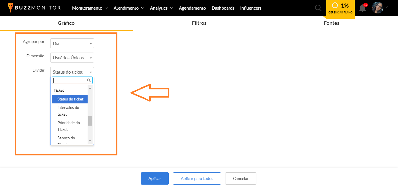 - Dividir: Status do ticket/ Intervalos do ticket/ Prioridade do ticket/ Serviço do ticket