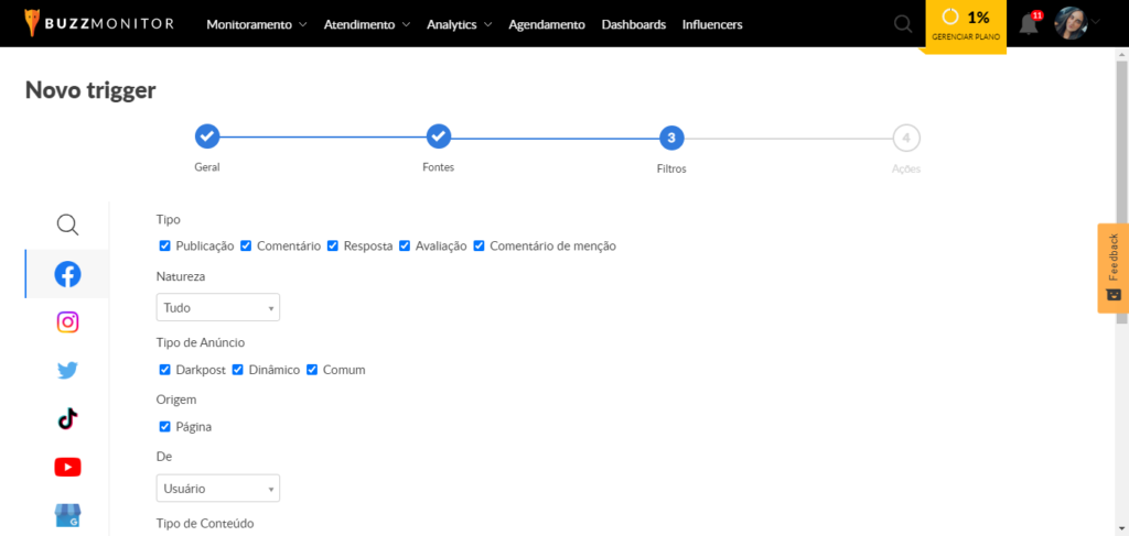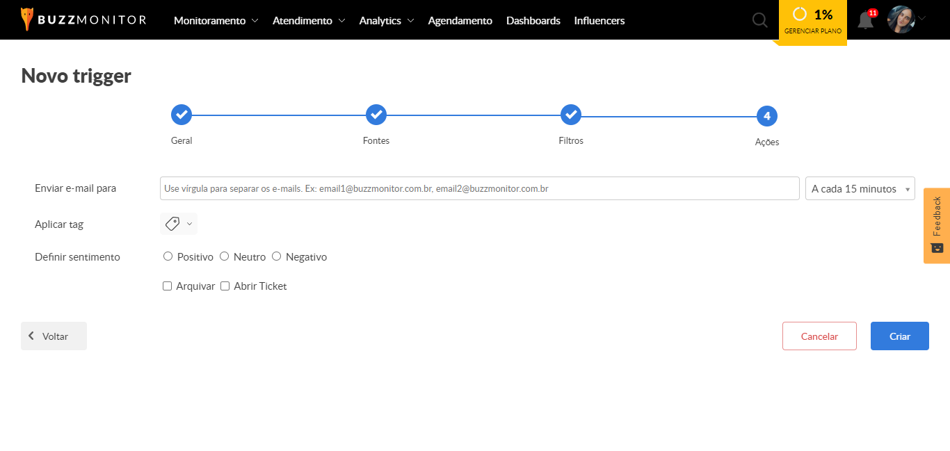 Para criar tickets automáticos, você utilizará o módulo Triggers, da Buzzmonitor (veja aqui como criar um trigger para sua conta).