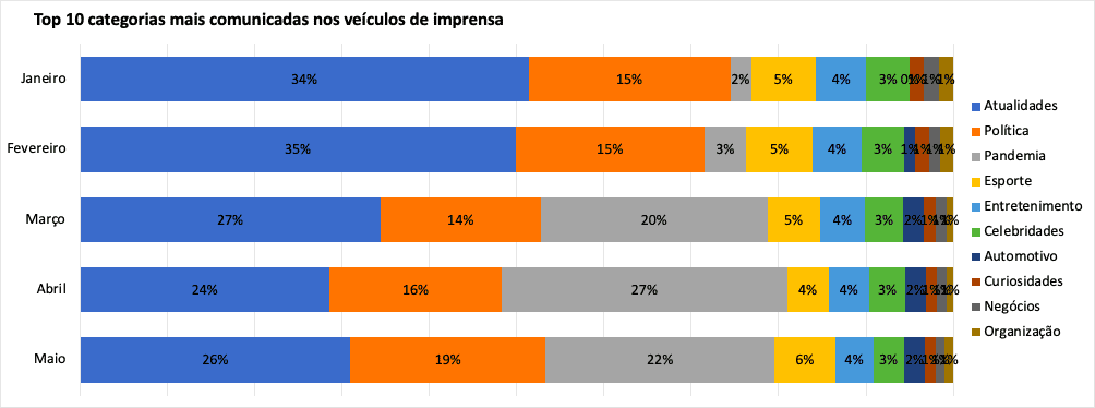 O cenário político sempre fez parte da pauta dos noticiosos, mas 2020 dividiu as atenções com um nova temática: a pandemia. Para entender como os veículos de comunicação abordaram ambos os temas, comparamos os cinco primeiros meses de 2020 isolando as notícias que diziam respeito exclusivamente ao cenário político versus aquelas que abordavam exclusivamente a pandemia.