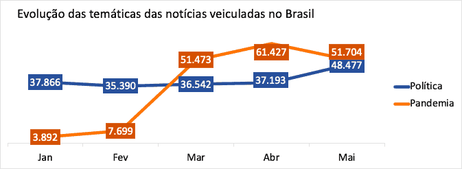 Nossa base de noticiosos acompanha diariamente os posts de mais de 1.700 páginas que veiculam conteúdos noticiosos no Facebook. De 1 de janeiro a 31 de maio estas páginas compartilharam ao todo 1.197.859 publicações sendo 16% (195.468) sobre política e 15% (176.195) sobre a pandemia. Nosso estudo revela que apesar da gravidade da temática envolvendo a crise sanitária, no Brasil, as questões políticas dividiram a quantidade de notícias produzidas. Para efeito comparativo, segundo o NYT, nos Estados Unidos, no mês de março, mais da metade do consumo de notícias no Facebook correspondia ao coronavírus.