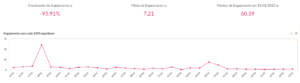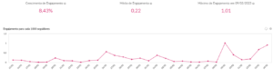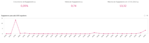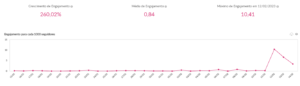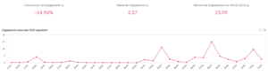 Nesse período estudado, a marca conquistou a média de engajamento de 2,37. No entanto, apesar do bom resultado, isso significou uma queda de 14,96%, se comparado ao período anterior. Os picos de engajamento do público ocorreram nos últimos 15 dias, como podemos ver no gráfico abaixo.