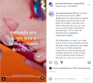 De 15 de janeiro a 14 de fevereiro, a marca fez três publicações orgânicas, todas em formato de reels e em parceria com influenciadores digitais, mas nenhuma teve ligação com o carnaval, seja no vídeo, na legenda ou em hashtags.