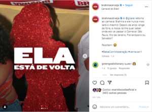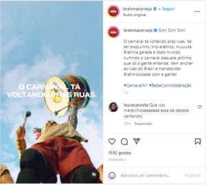 A marca começou a campanha de carnaval já em 2 de janeiro, com uma publicação em parceria com a cantora Claudia Leitte, com o tema “Já é carnaval! Em 2023 a folia volta para as ruas”. Outros conteúdos em reels e carrossel também reforçaram a celebração pelo retorno do carnaval de rua, com jingle da Brahma no Carnaval.