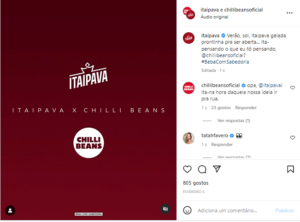 Outro lançamento que a cervejaria fez nesse período foi a coleção de óculos de sol com abridor de garrafa integrado à haste, em parceria com Chilli Beans. Para esta ação, a marca também fez principalmente posts em reels.