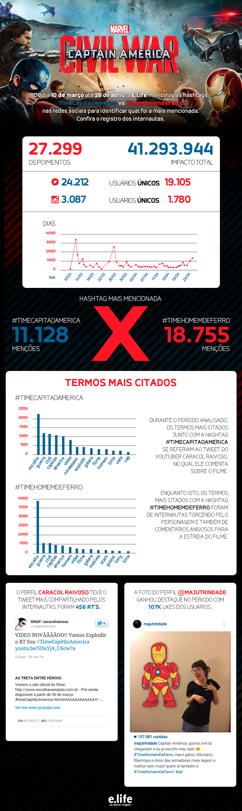 O estudo feito pela E.Life entre os dias 10 de março e 26 de abril nos ajuda a entender um pouco mais a expectativa dos fãs em relação ao filme, como, por exemplo, a repercussão das hashtags #TIMECAPITAOAMERICA  e #TIMEHOMEMDEFERRO.