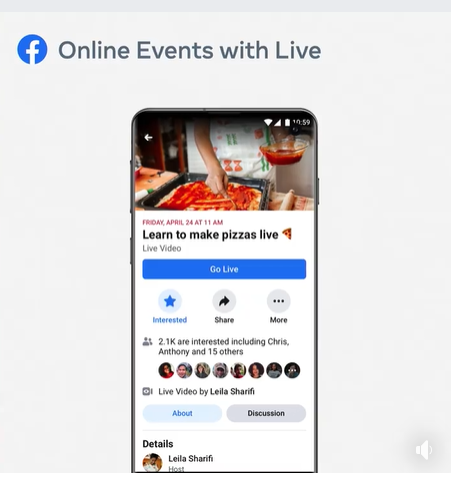Outra novidade será a organização de eventos online na plataforma. Isso permite utilizar todos os recursos já disponíveis em Eventos do Facebook para criar transmissões ao vivo para grandes audiências.