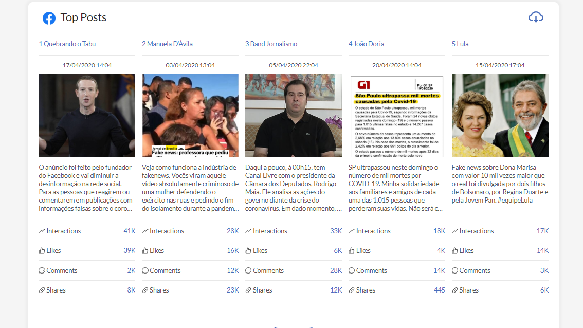 A notícia que mais chama a atenção, é a da página Quebrando o Tabu que fala sobre as medidas que o Facebook está tomando para que as pessoas não caiam em Fake News sobre o Coronavírus. A rede social vai enviar alertas para os usuários que abrirem, curtirem ou compartilharem notícias falsas direcionando eles a sites mais confiáveis.
