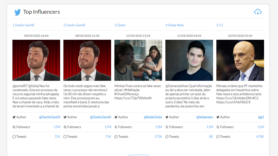 A rede social Twitter, que teve o maior engajamento com posts citando o termo “fake news”, tem como Top Influencers: