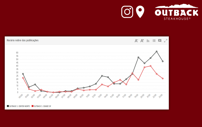 É possível acompanhar quais são os horários com mais buzz em cada franquia e comparar duas ou mais em um mesmo gráfico. No exemplo abaixo, o pico do Outback Center Norte é às 22h, enquanto no Outback Cidade São Paulo o pico é às 21h.