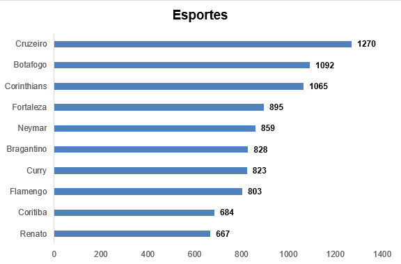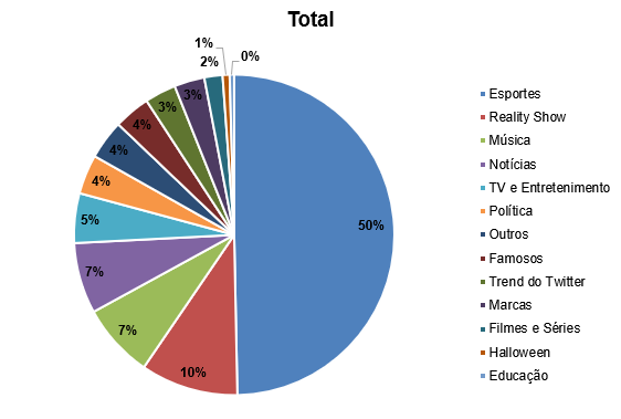 A categoria que mais emplacou nos TT’s, no entanto, foi Esportes, representando 50% do total das conversas. Seguida por Reality Shows (10%), Música (7%), Notícias (7%), e TV e Entretenimento (5%).