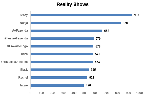 Na categoria de Reality Shows, “A Fazenda”, da Record TV, obteve o maior destaque, sendo responsável por nove dos 10 tópicos mais comentados.