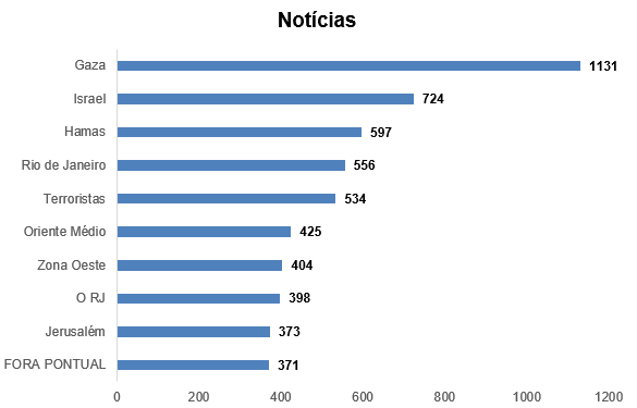 Em relação ao conflito, as palavras “Israel“, “Hamas“, “Jerusalém“, “Oriente Médio” e “Terroristas” foram as mais frequentes nos tópicos mais comentados. Além disso, “Egito“, que é um destino para aqueles que fogem da guerra, também teve destaque.