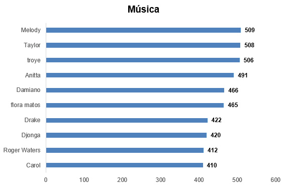 Na categoria musical, que teve 7% de todo o buzz dos trending topics, a cantora “Melody” se destacou após o lançamento da sua nova música, “Cara de Anjo”, uma releitura da música “Meiga e Abusada”, de Anitta, com quem tem uma relação conturbada, entre admiração e polêmica nas redes sociais.