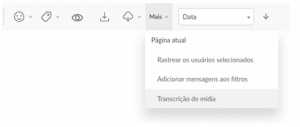 A funcionalidade permite selecionar até 100 interações e/ou a página atual e executar a transcrição de: