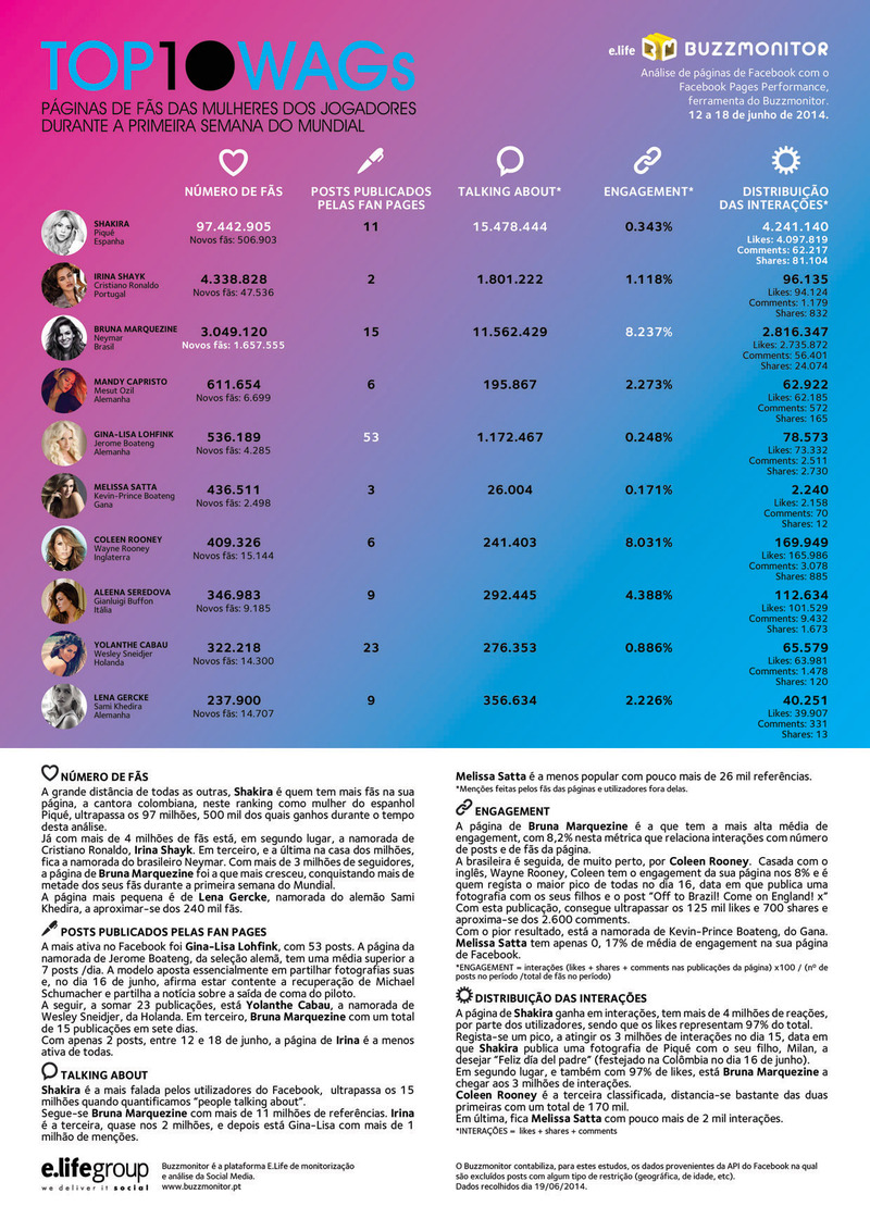 A equipe do Buzzmonitor utilizou a ferramenta Facebook Pages Performance para calcular de uma maneira rápida e eficiente diversas métricas das páginas das WAGS (sigla em inglês para esposas e namoradas de grandes esportistas) do Mundial 2014. O resultado, obtido entre o período de 12 a 18 de junho, foi bastante preciso e completo.