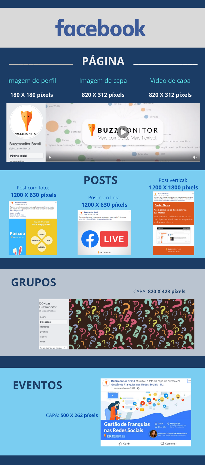 Para você manter suas imagens e publicações do Facebook nos formatos corretos, criamos um infográfico que mostra o tamanho das imagens que são utilizadas na rede social.