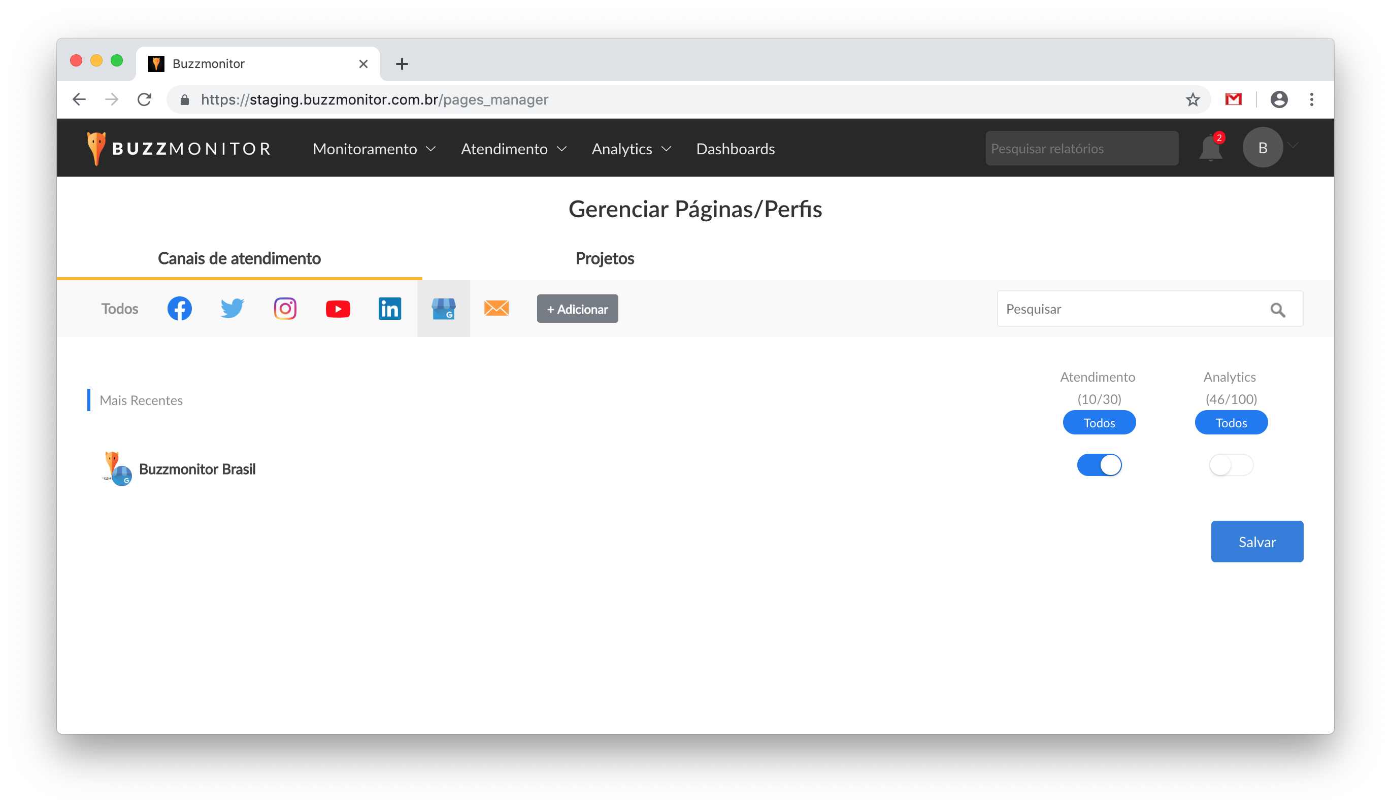 Página de gerenciamento de páginas/perfis de atendimento – Uma nova página de gerenciamento de perfis de atendimento foi adicionada ao Buzzmonitor. Ao associar alguma nova conta ao Buzzmonitor, o usuário será redirecionado a essa página e poderá definir quais os canais que tem interesse de registrar na aplicação. Cada conta deve respeitar o limite de perfis definido nas configurações e só é possível prosseguir com o registro quando esse limite não estiver sendo ultrapassado. Para contas freemium o limite é de até 3 perfis.