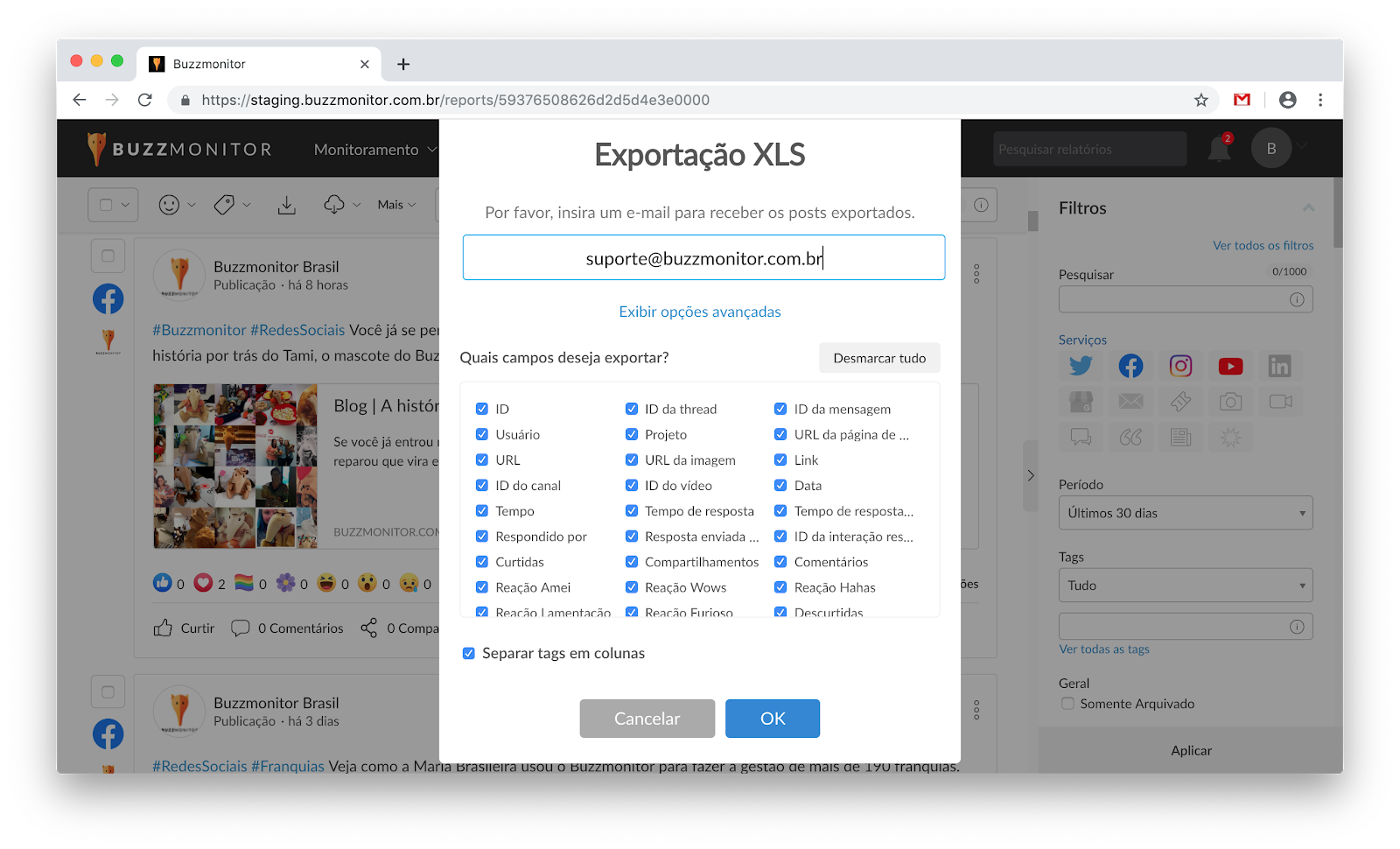 Opções avançadas ao exportar planilha – Agora é possível selecionar os campos que devem ser exportados na planilha e também definir se as tags devem ser separadas em colunas ou não.