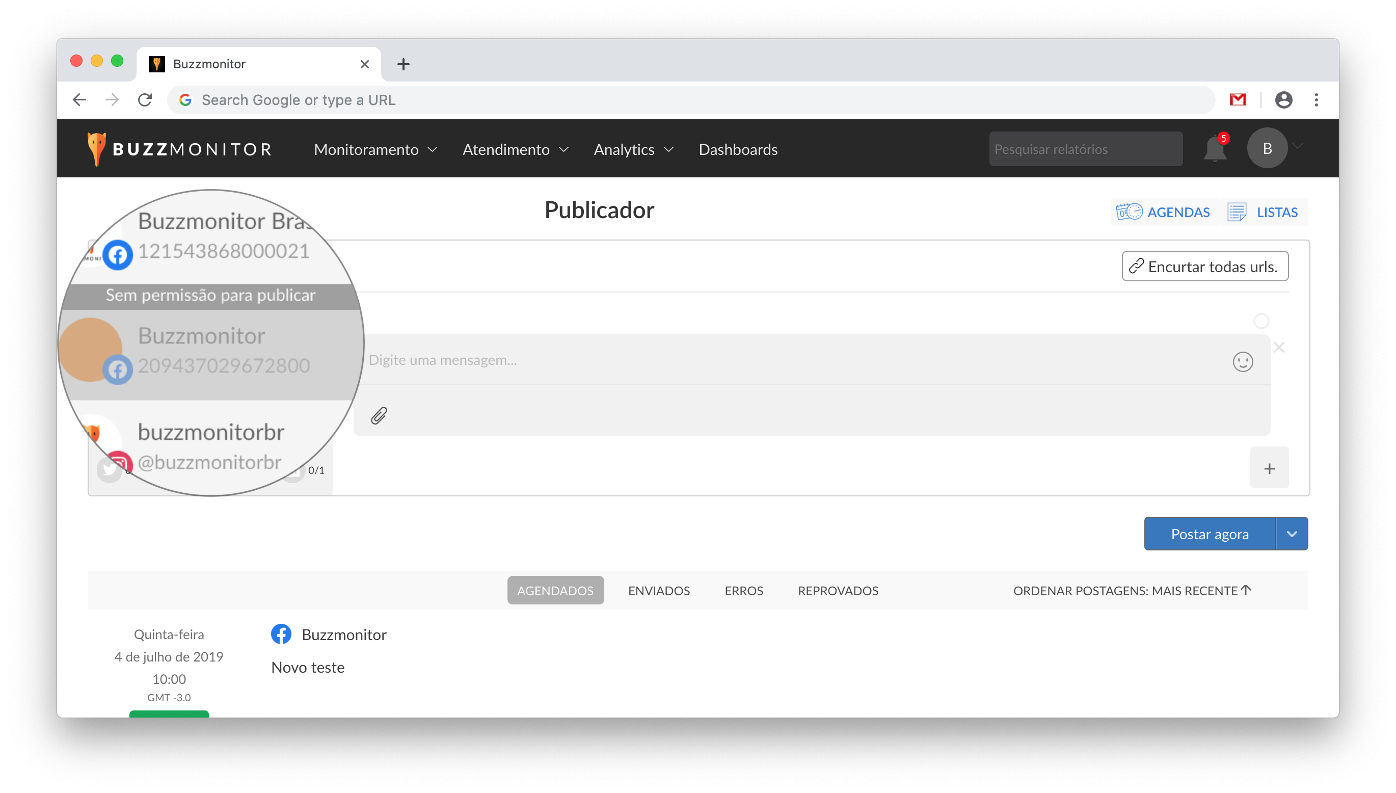 Alerta de perfil/página sem permissão para publicar – Um alerta será exibido no Agendamento quando um perfil/página que foi associado ao Buzzmonitor não tiver as permissões necessárias para envio de uma publicação. Dessa forma, o usuário já é avisado que existe algum problema de configuração para determinado perfil.