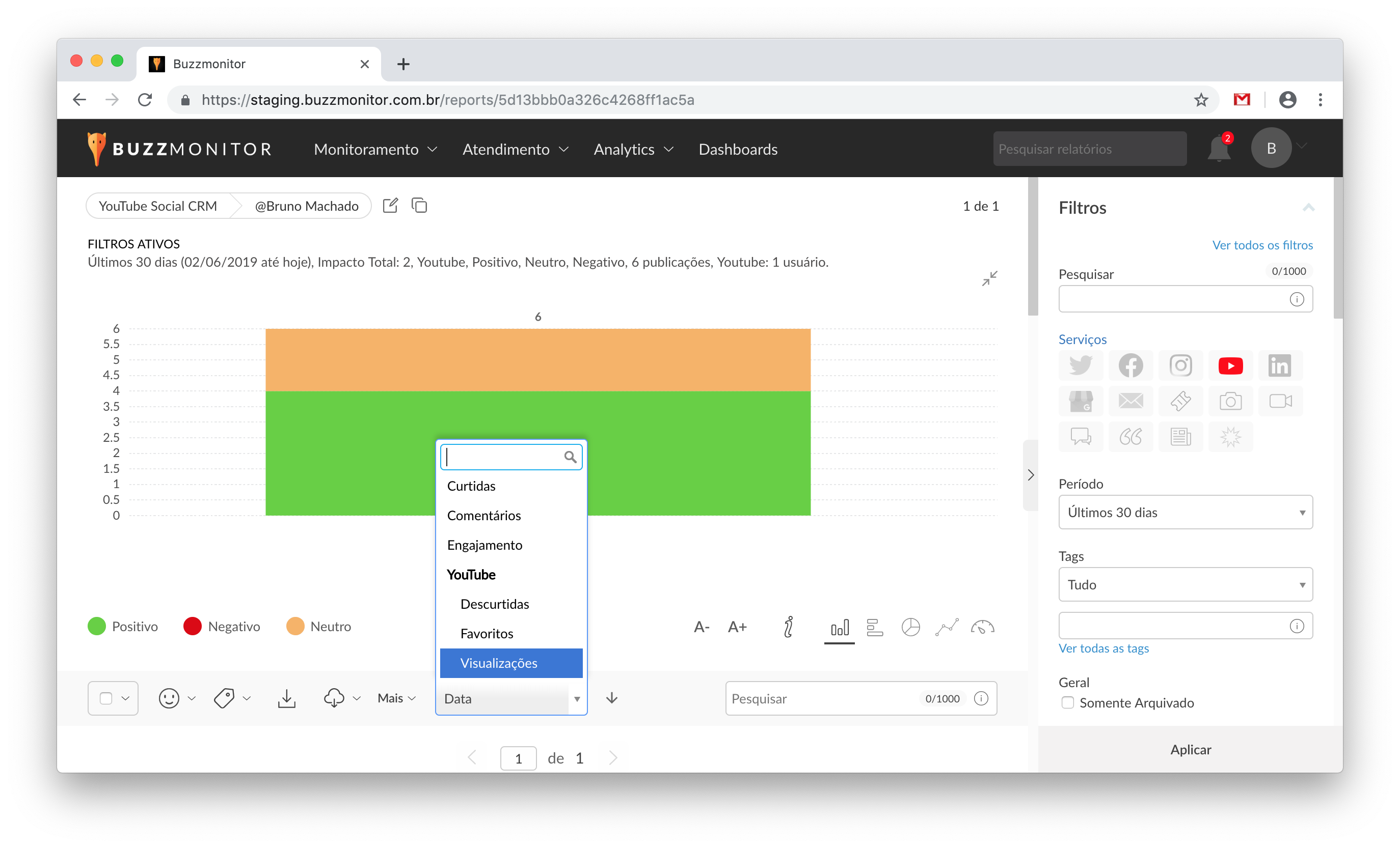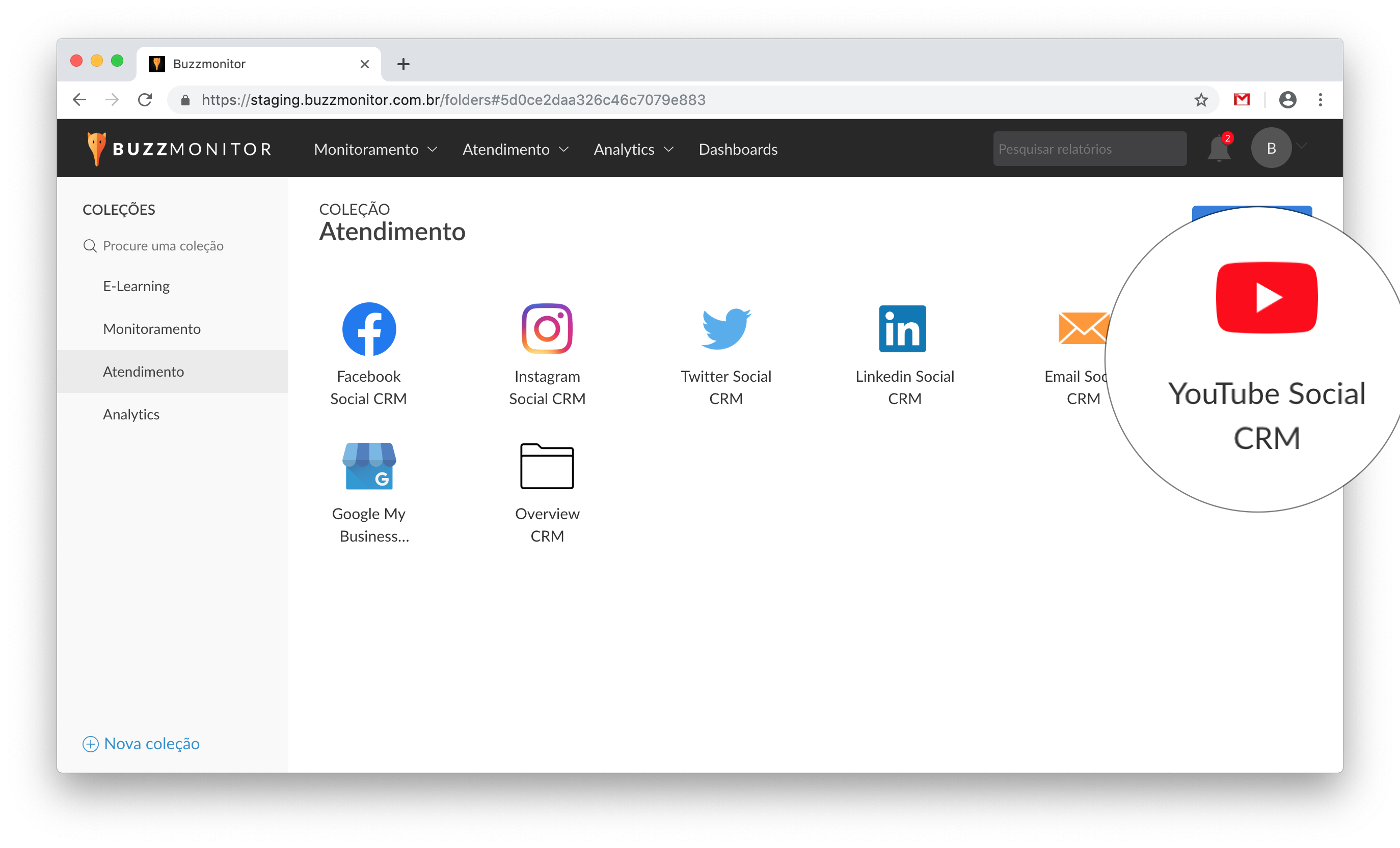 Atendimento de canais de YouTube – Agora o YouTube tem a sua própria pasta no módulo de atendimento do Buzzmonitor. Os canais do YouTube passam a ser listados separadamente na lista de fontes de um relatório, funcionamento da mesma forma que as outras redes sociais.