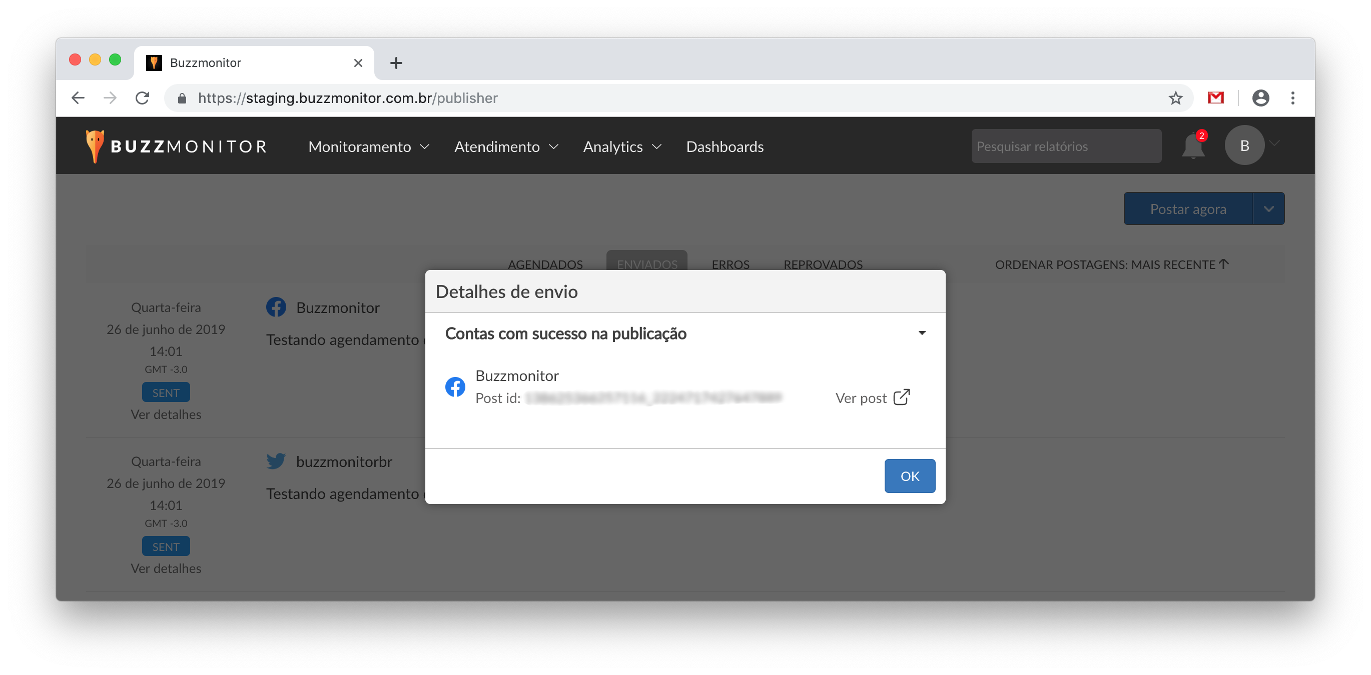Visualização de link do agendamento – O link de publicações já enviadas passa a ser exibido através do link “Ver detalhes”.