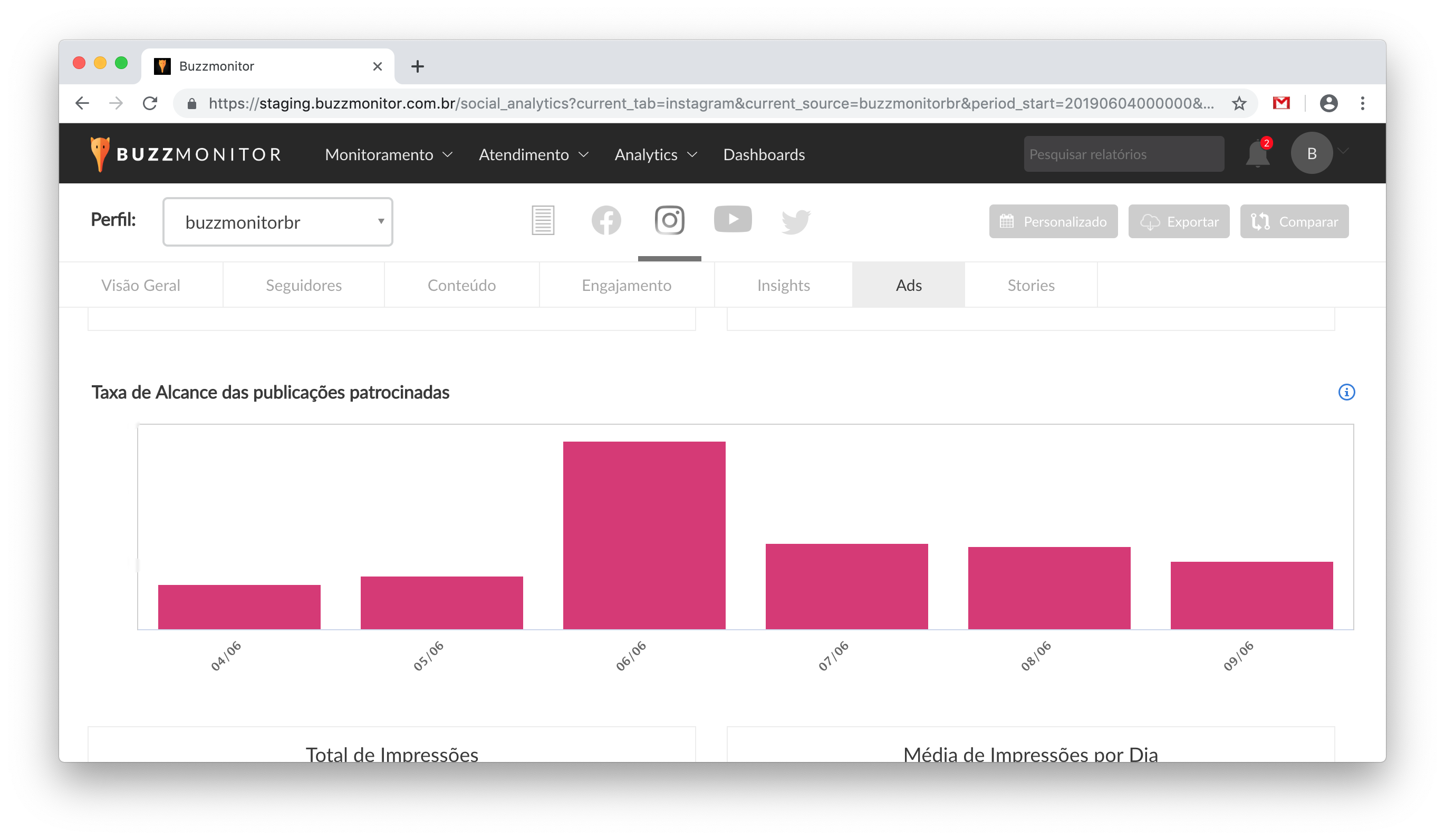 Novos dados de alcance, impressões e visualizações de Ads Instagram – Novos gráficos relacionados ao alcance, impressões e visualizações de Ads foram adicionados a aba de Ads no Analytics Pro.