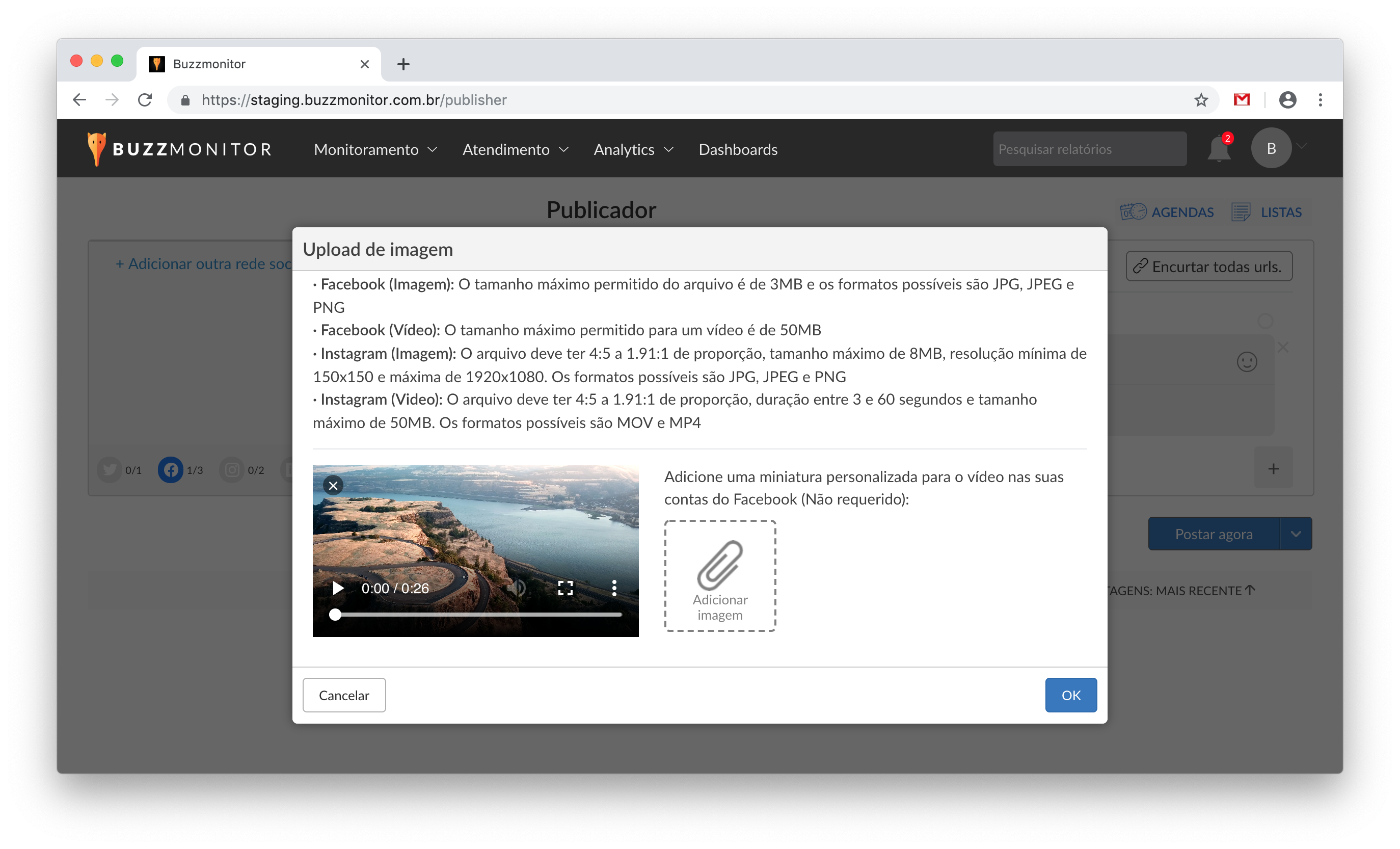 Escolha de capa para publicação de vídeo no Facebook – Ao agendar uma publicação de um vídeo para Facebook, agora também é possível definir uma imagem que vai ser exibida como capa do vídeo na postagem exibida na página.
