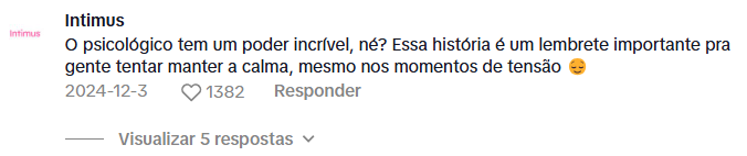 A marca Intimus já atua no Listening de Categoria para oportunidades de interação. Em um vídeo no TikTok, com o tema “ficar achando que tá grávida atrasa a sua menstruação”, a resposta da marca atingiu 1.167 likes. O time de atendimento da Elife – responsável pelas interações da Intimus – aproveitou para falar sobre como é importante tentar manter a calma.