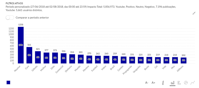 Dentre os principais termos que aparecem no vídeo da campanha, 6% se referem a “Melhor, 5% a “Dinheiro” e 3% a “Vergonha”. Como já era esperado, a maior parte dos comentários fazem referência ao próprio jogador, de forma que termo “Neymar” está presente em 19% deles.