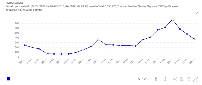 No caso da campanha da Gillette, o pico de interações é às 20h. Esse é o momento em que a marca deve estar mais atenta à repercussão de sua campanha e ao que os internautas estão falando, especialmente em casos de crise.