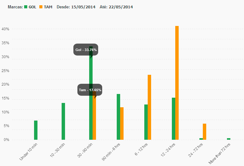 A TAM demorou de 30 a 90 minutos para responder 17.65% dos posts feitos pelos usuários, enquanto que a GOL respondeu 33.76%.