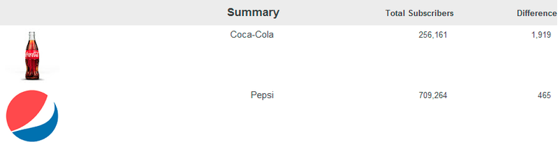 Abaixo, a imagem mostra a diferença entre os canais internacionais da Coca-Cola e Pepsi. Embora a Pepsi tenha um maior número de assinantes, no período de março a abril de 2014, foi a Coca-Cola quem conseguiu um maior crescimento, calculado em mais de sete mil novos assinantes.