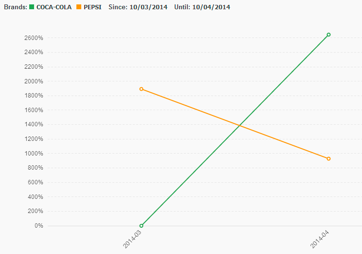 No exemplo abaixo, feito com base nos canais internacionais da Coca-Cola e Pepsi, vê-se que o engajamento da Pepsi em março foi superior ao da Coca-Cola, que por fim acabou superando a concorrente em abril.